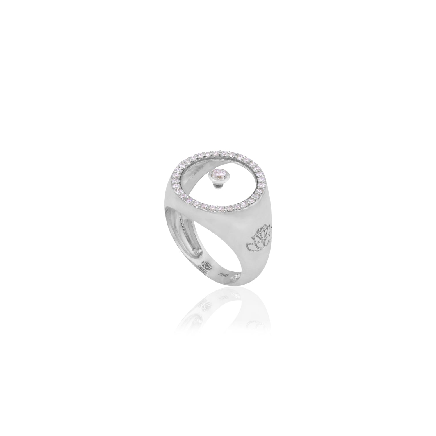 This handcrafted April birthstone ring features a round brilliant cut diamond in a bezel setting framed by quartz, further accented with a halo of pavé diamonds, adding a touch of timeless sophistication to this exquisite piece.